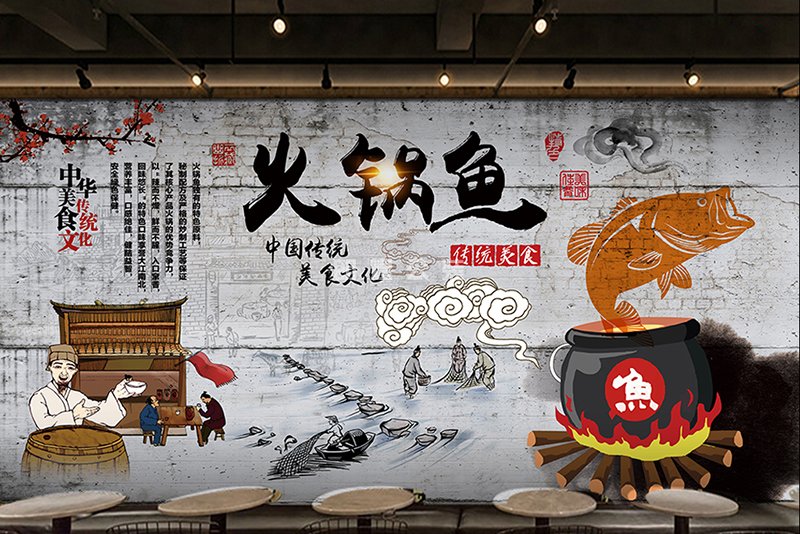 魚火鍋店墻面彩繪